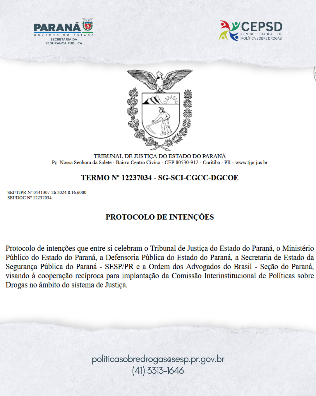 Em uma iniciativa inédita de articulação no âmbito do Sistema de Justiça, foi assinado o para a implantação da Comissão Interinstitucional de Políticas sobre Drogas do Estado do Paraná. O documento consolida um compromisso conjunto entre o Tribunal de Justiça do Paraná (TJPR), o Ministério Público do Estado do Paraná (MPPR), a Defensoria Pública do Estado do Paraná (DPE-PR), a Secretaria de Estado da Segurança Pública (SESP/PR) e a Ordem dos Advogados do Brasil – Seção Paraná (OAB/PR).